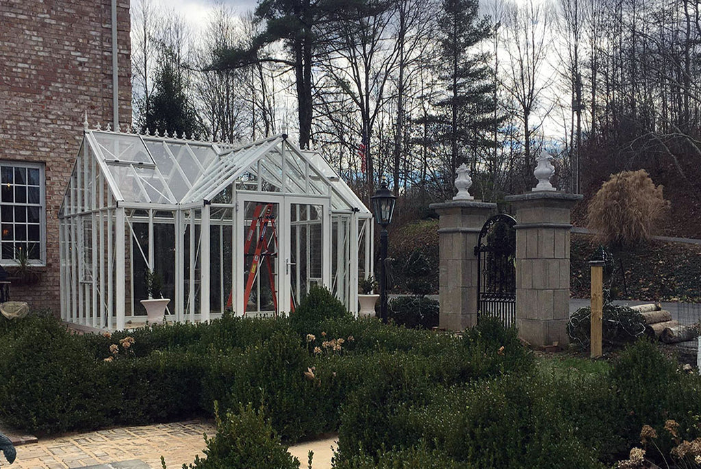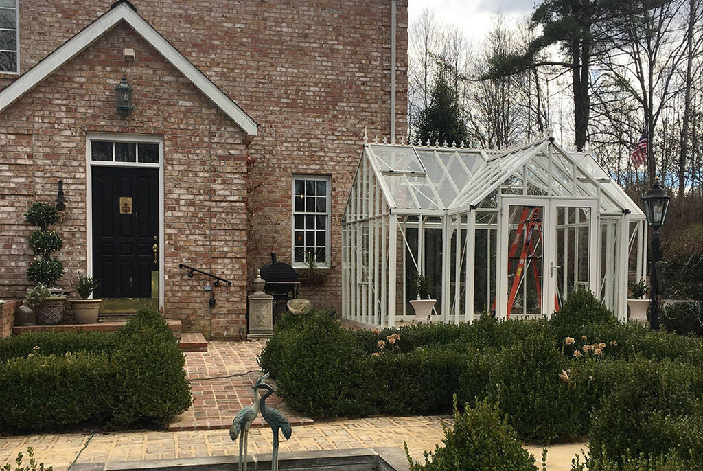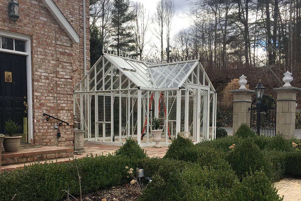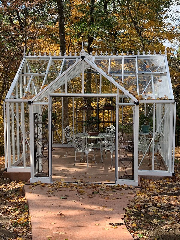 The elegant framework of this greenhouse, combining old world style with modern European engineering, creates a gorgeous space to nurture plants and relax in your backyard.