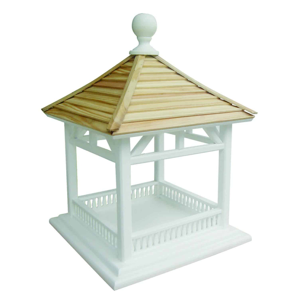 This fly-through gazebo dream house feeder is perfect for just about any setting. Constructed of exterior grade ply-board and topped with a pine shingled roof, the large open area can be used with seed or can easily accommodate a piece of fruit for Orioles to enjoy.