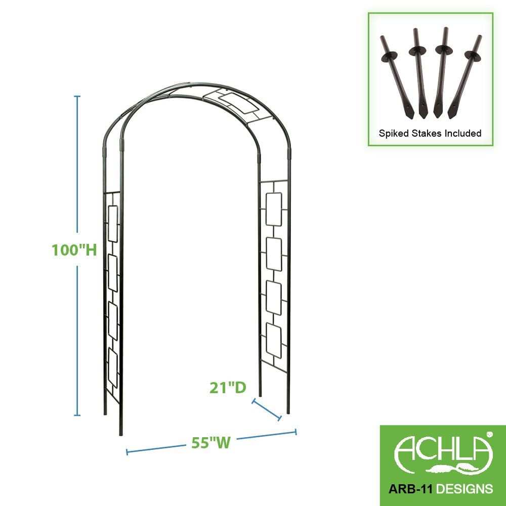 Simple arched design with a square motif along the top and sides. Provides sturdy support for plants.