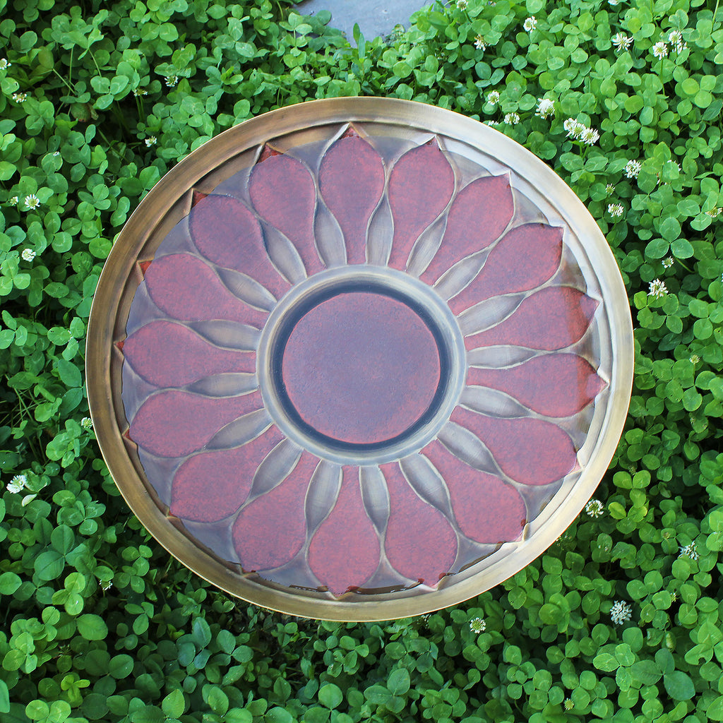 This birdbath is a beautiful garden accent piece, featuring a bold red, embossed sunburst pattern.