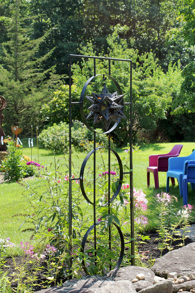 The uppermost ring has a small hook for hanging a bell, gong, lantern or bird feeder.