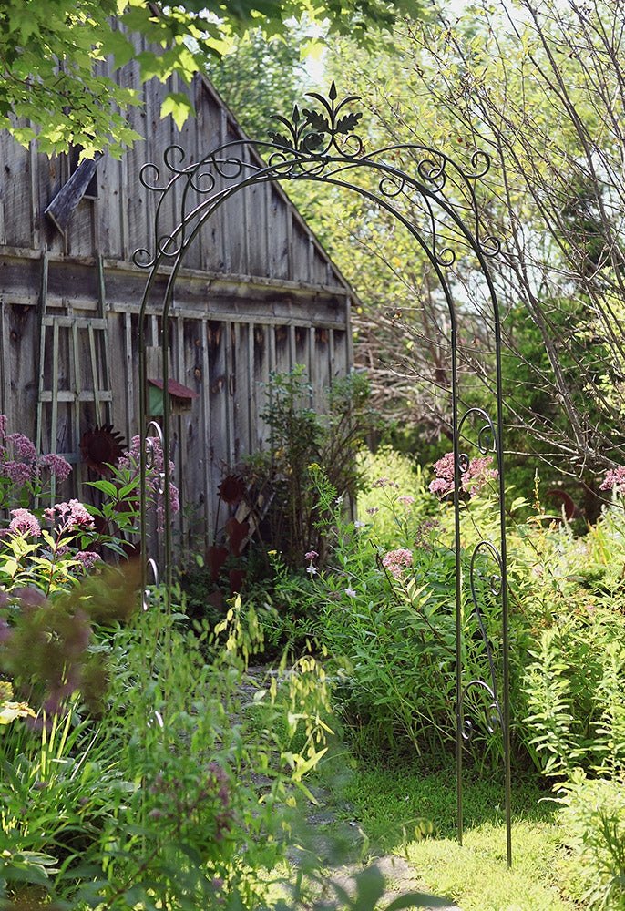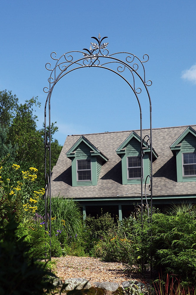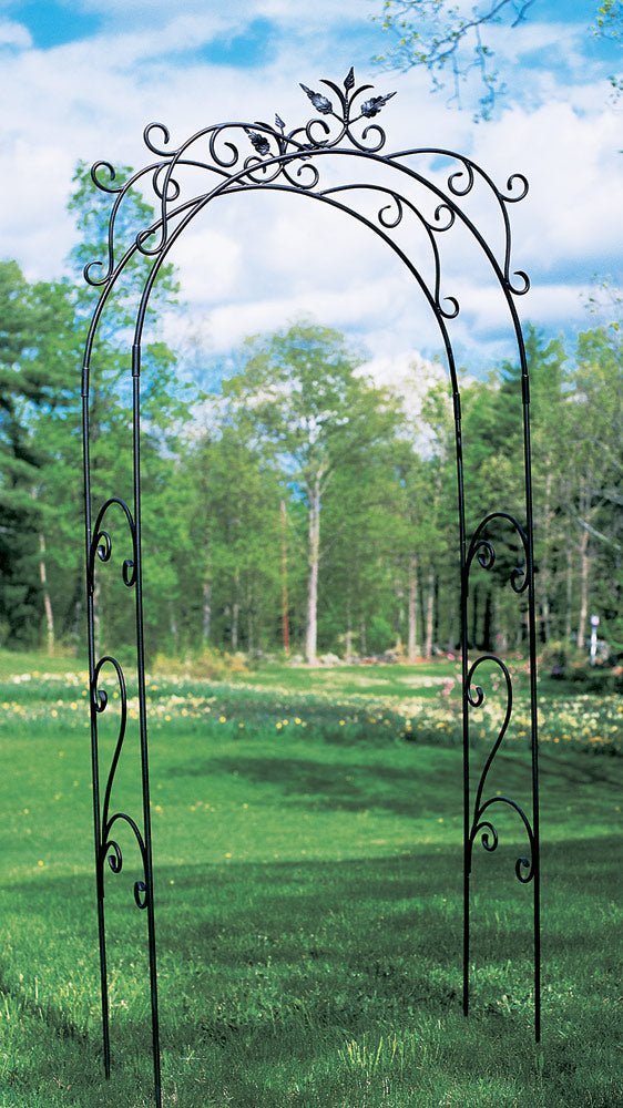 The sides and upper arch of the arbor feature a traditional European scroll design and the top of the arbor features a finial with three upward pointed leaves.