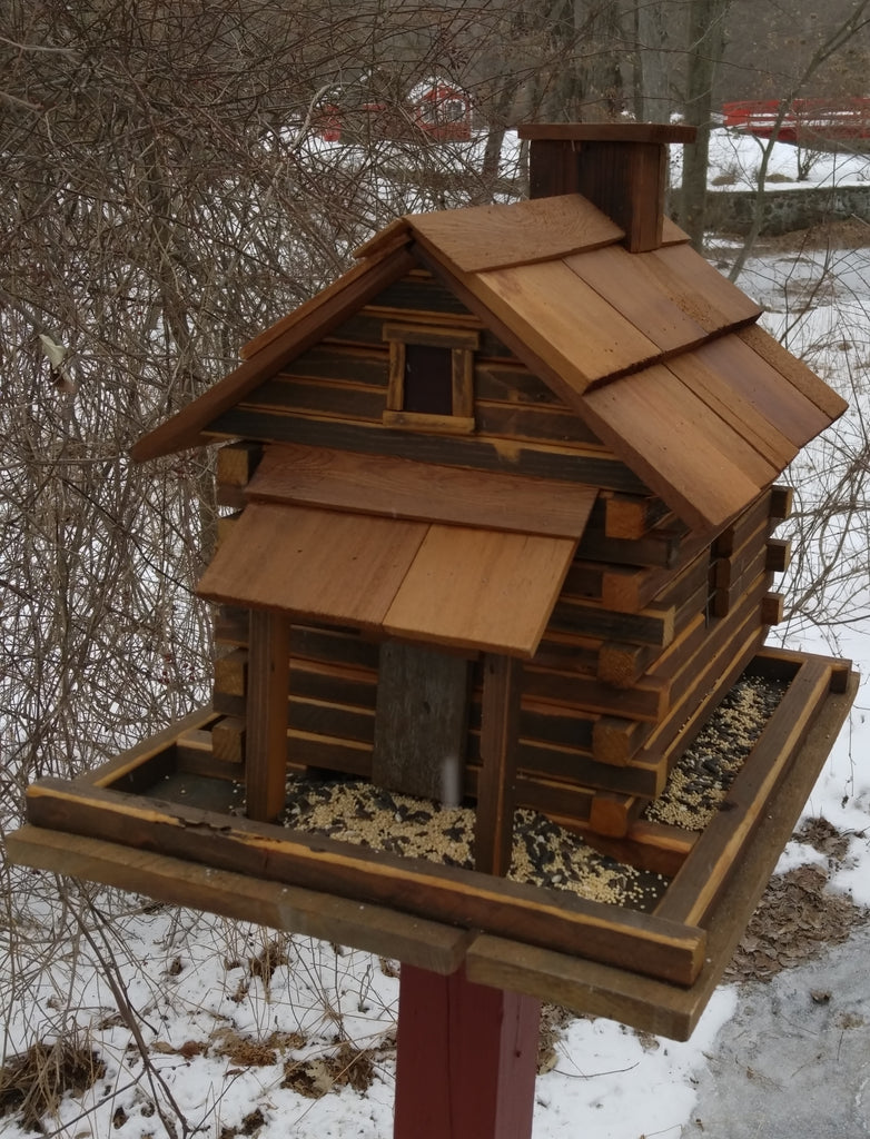 This traditional log cabin hopper-style feeder is made from reclaimed natural cedar and can hold over 10 lbs of bird seed.